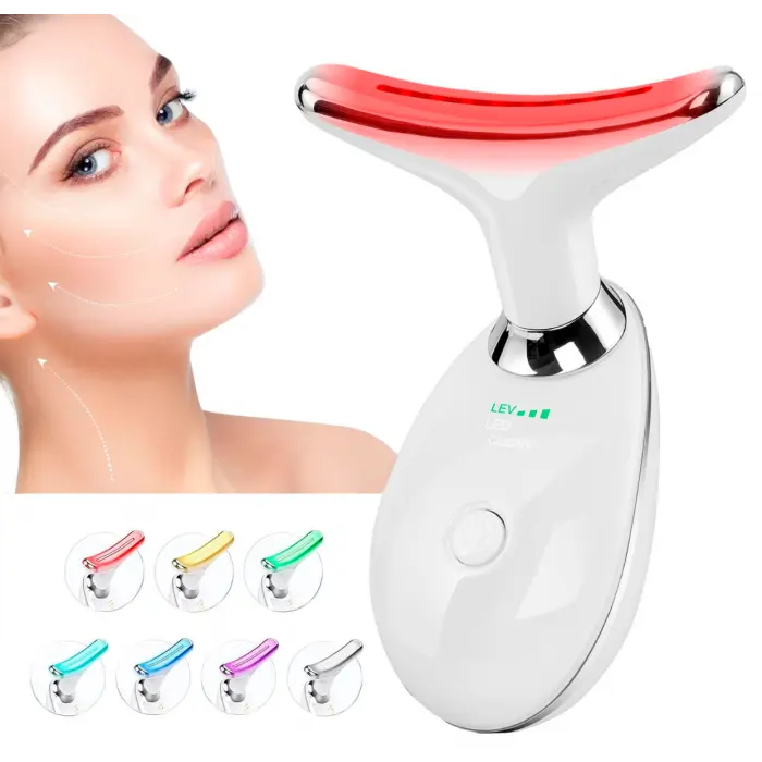 "Dispositivo masajeador de cara y cuelloElimina marcas y pliegues.Modelo de 7 modos de luz, cada uno asociado a diferentes objetivos de piel.Carga por USBColor Blanco