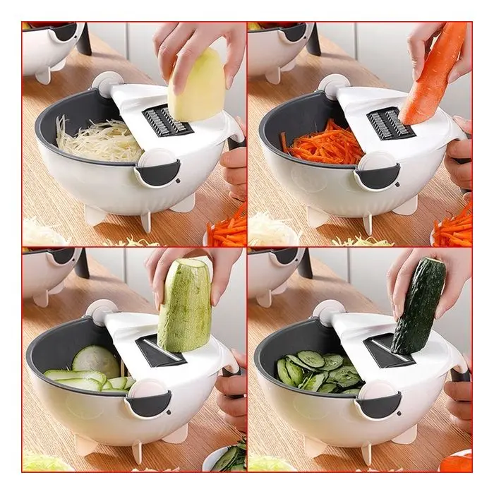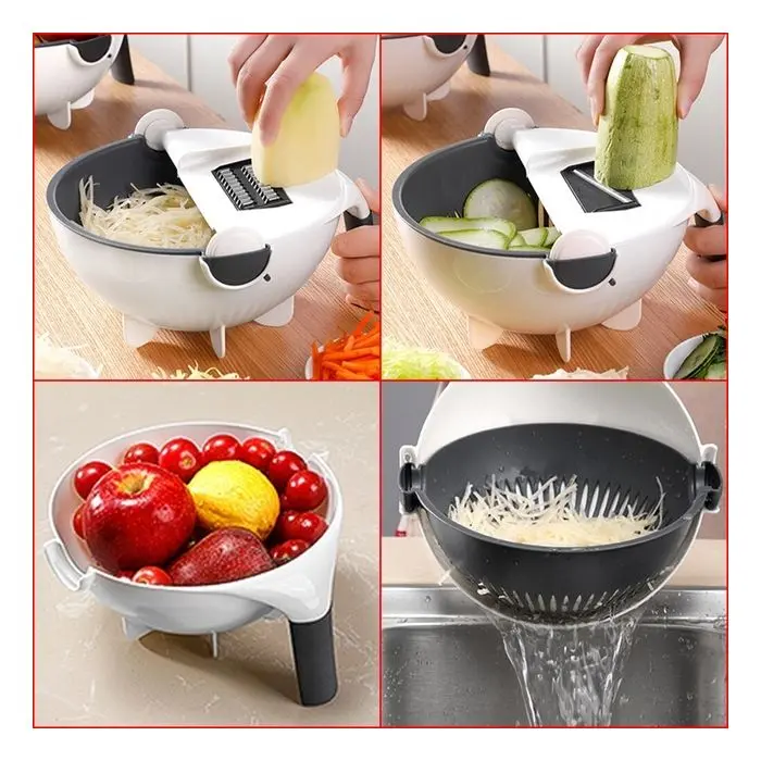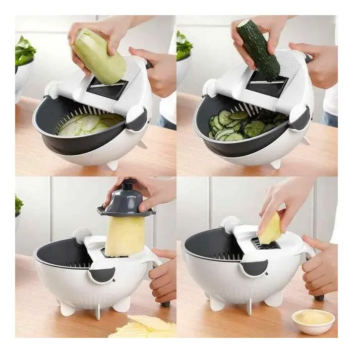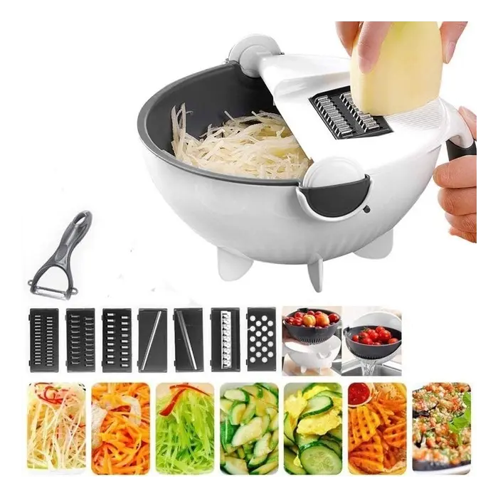 Multi rallador mandolina con 7 cuchillas Incluye: Taper - Colador rebatible - Pela papasMedidas: 22cm de diametro - 11cm de alturaMedidas cuchillas: - Rallador: 1 - 3 - 4 - 8mm- Rebanador: 1.5 - 2.5mm- Ondeador: 3mm